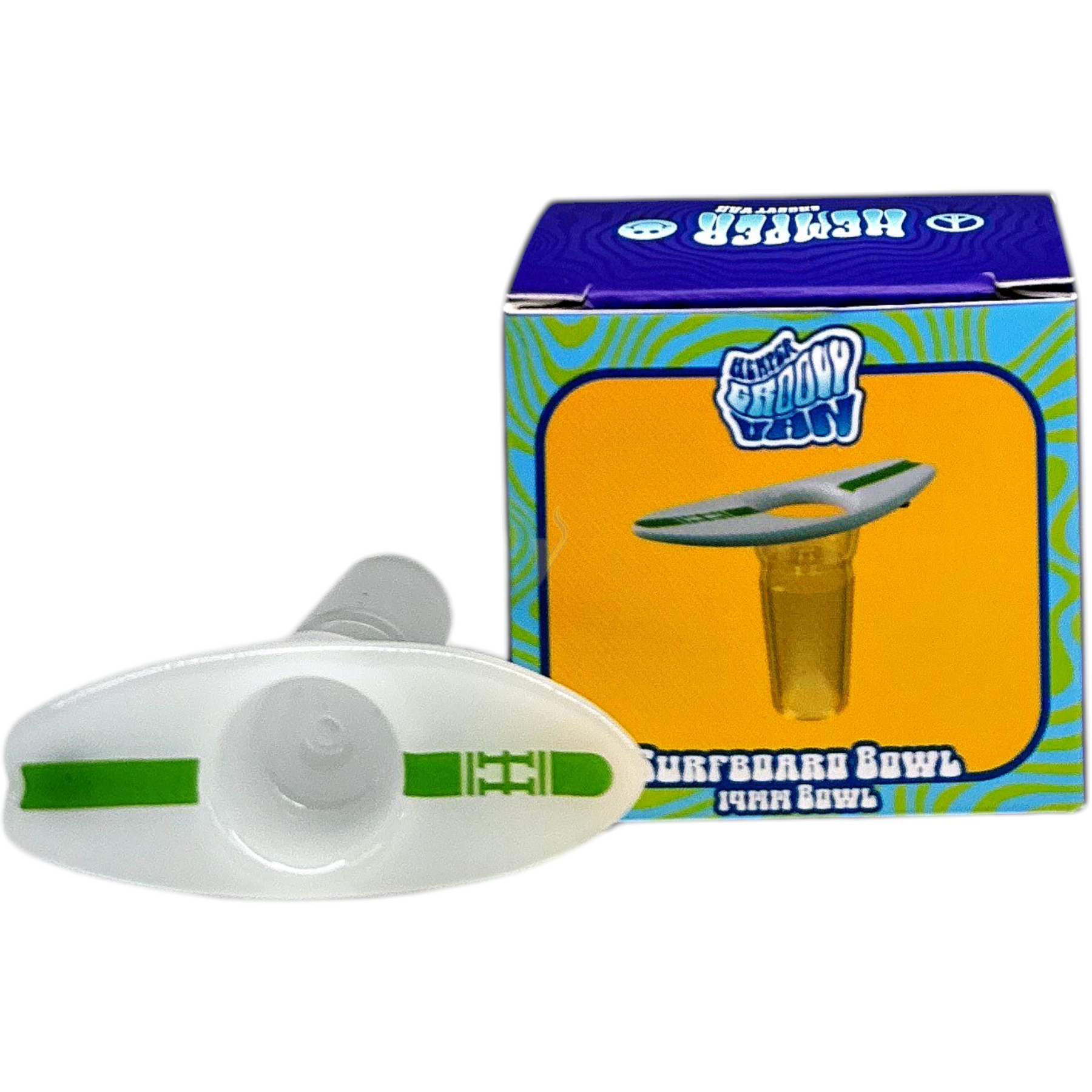 Shaped like a mini surfboard with a crisp white deck and green stripe, this 14mm male glass bowl drops in, packs evenly, and draws clean so your dry herb shines.