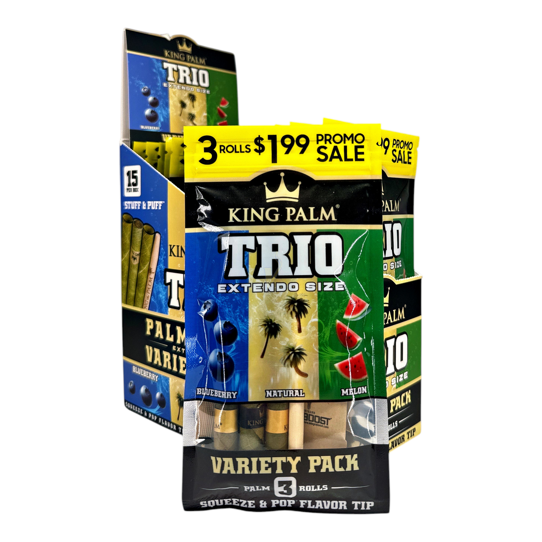 Go long with a smooth, easy session. The King Palm Trio Extendo Size brings you extra-long palm-leaf rolls that are ready to pack, slow to burn, and simple to share—no rolling skills required. With three rolls in a value-priced pack, it’s a grab-and-go favorite for laid-back hangouts and leisurely solo time alike.